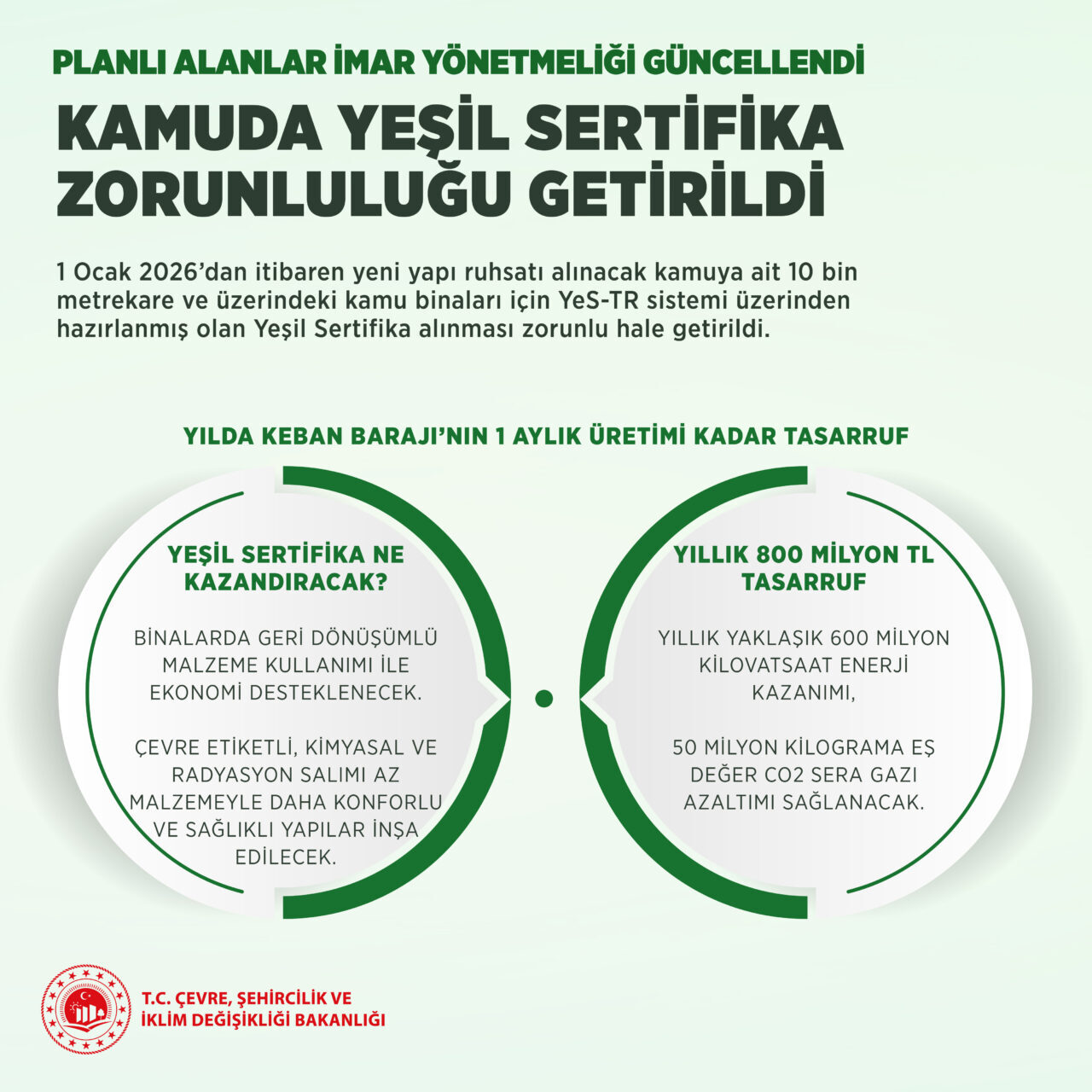Güncellemeyle, 2026’dan sonra inşa edilecek, toplam inşaat alanı 10 bin metrekarenin üzerinde olan yeni kamu binalarının YeS-TR sertifikasına (Yeşil Sertifika) sahip olması zorunlu hale getirilecek. Bu kapsamda, yıllık yaklaşık 600 milyon kilovatsaat enerji kazanımı ile Keban Barajı’nın 1 ayda ürettiği enerji kadar tasarruf sağlanmış olacak. 8 dönüm orman alanına eş değer 50 milyon kilogram sera gazı azaltımı ile 800 milyon TL tasarruf elde edilecek. Yeşil Sertifikalı binalarda, geri dönüşümlü malzeme kullanımıyla ekonomik kayıpların önüne geçilecek. Çevre etiketli, kimyasal ve radyasyon salımı az malzeme kullanımıyla da daha konforlu ve sağlıklı yapılar inşa edilecek.