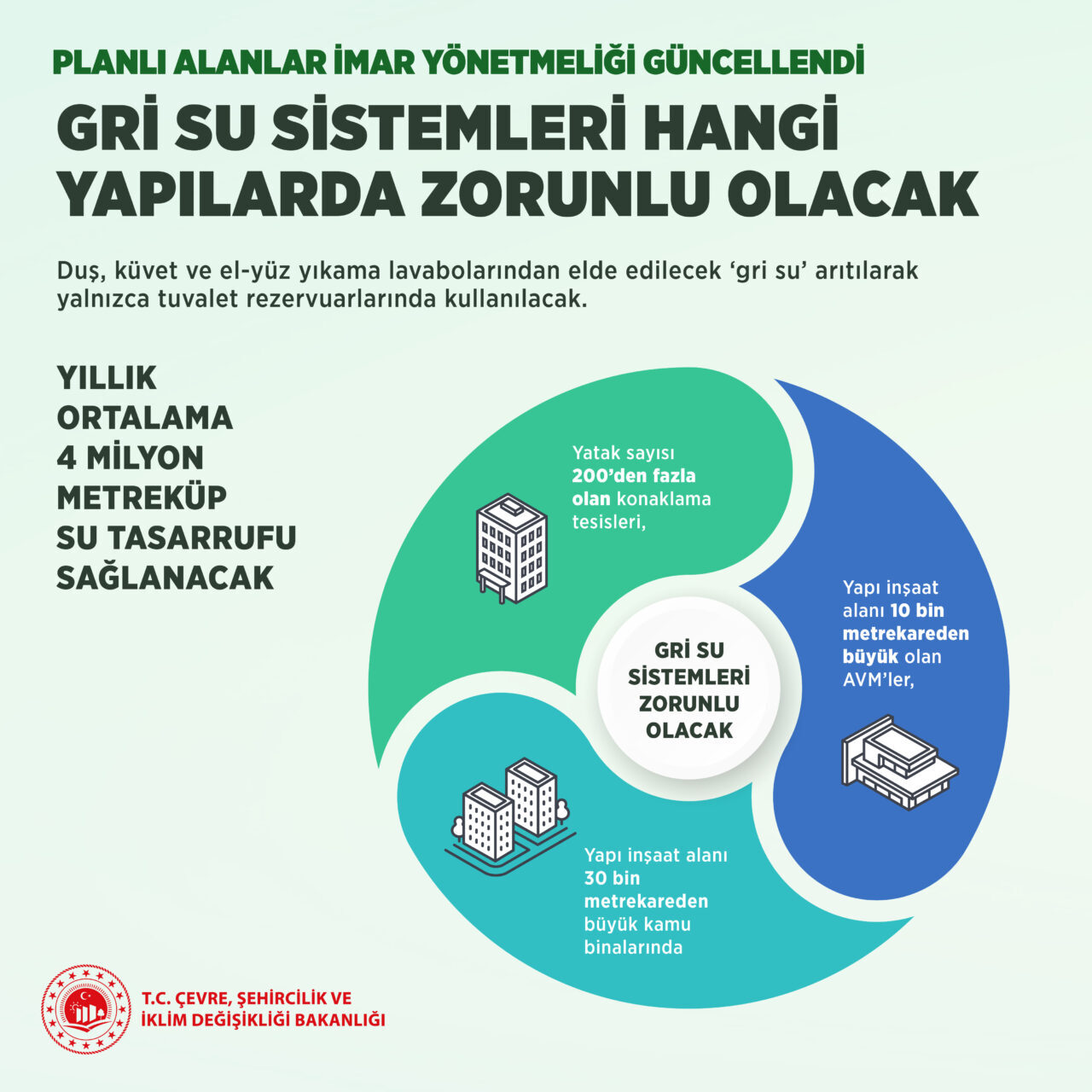 Gri su yani; duş, küvet ve el-yüz yıkama lavabolarından elde edilen sular ise arıtılıp sadece tuvalet rezervuarlarında kullanılacak. Gri su sistemleri, yatak sayısı 200’den fazla olan konaklama tesisleri, yapı inşaat alanı 10 bin metrekareden büyük olan AVM’ler ve yapı inşaat alanı 30 bin metrekareden büyük kamu binalarında zorunlu olacak. Bu şekilde binalarda yıllık ortalama 4 milyon metreküp su tasarrufu sağlanacak. Yağmur suyu ve gri su sistemleriyle 1,5 yılda Mogan Gölü kadar sudan tasarruf edilmesi hedefleniyor. Düzenlemenin yürürlüğe gireceği tarihten önce mevcut olan binalardaki tadilat ve benzeri inşaat ruhsatı işlemlerinde bu sistemlerin tesis edilmesi zorunlu tutulmayacak.