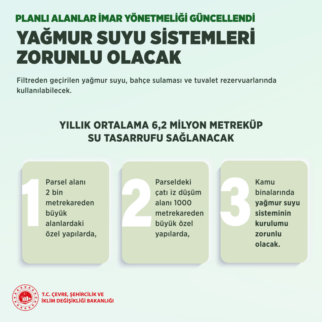 Çevre, Şehircilik ve İklim Değişikliği Bakanlığı’ndan yapılan açıklamaya göre, Mesleki Hizmetler Genel Müdürlüğü tarafından hazırlanan ‘Planlı Alanlar İmar Yönetmeliği’nde değişiklik yapıldı. Resmi Gazete’de yayımlanarak yürürlüğe giren yönetmelikle, binalarda yağmur suyu ve gri su kullanımından ‘Yeşil Sertifika’ya, elektrikli araçlar için kurulacak şarj ünitelerinden engelsiz çocuk oyun alanlarına kadar pek çok başlıkta düzenleme yapıldı. Yönetmelikte 1 Ocak 2026’dan sonra yapılacak belli büyüklük ve tipteki özel ve kamu binalarında yağmur suyu ve gri su sistemlerinin kurulumu zorunlu olacak. Filtreden geçirilen yağmur suyu, bahçe sulaması ve tuvalet rezervuarlarında kullanılacak. Yağmur suyu sistemi, depo hacmi 7 metreküpün üzerinde olan parsel alanı 2 bin metrekareden büyük alanlardaki yapılar, parseldeki çatı iz düşümü alanı 1000 metrekareden büyük özel yapılar ve kamu binalarında zorunlu olacak. Bu sayede binalarda yıllık ortalama 6,2 milyon metreküp su tasarrufu sağlanacak.