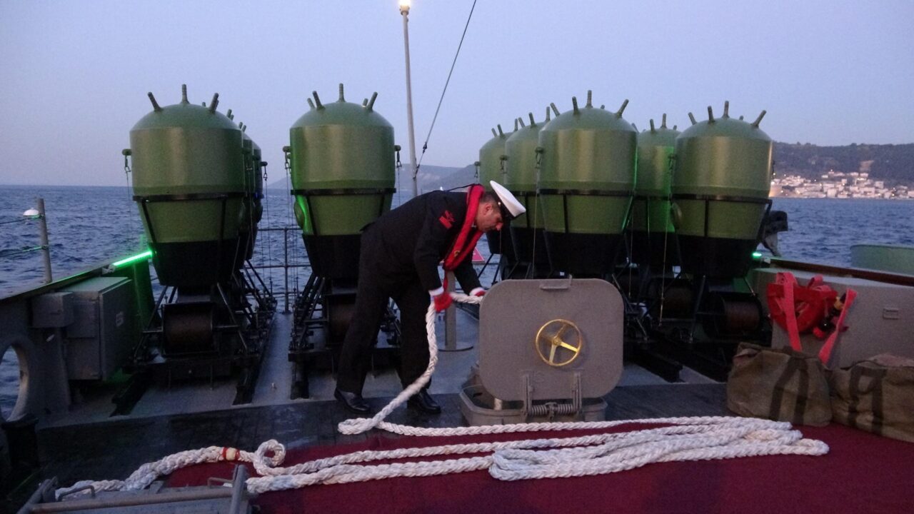 Konuşmanın ardından Çanakkale Valisi Ömer Toraman, Çanakkale Belediye Başkanı Muharrem Erkek ve Çanakkale Boğaz ve Garnizon Komutanı Tuğamiral Mustafa Biçen, 110 yıl önce mayın bırakılan noktaya çelenk koydu. Tören, hatıra fotoğrafının çekilmesinin ardından sona erdi. Milli Savunma Bakanlığı’nın davetiyle bu yıl ki törene Siirt Şirvan Mesleki ve Teknik Anadolu Lisesi’nden 9 öğrenci katıldı. Öğrencilerden Rumeysa Orhan, “Çanakkale’ye gezmeye geldik. Burası, bizim için önemli bir yer. Vatanımızı tanıdık. Milli Savunma Bakanlığı’na teşekkür ediyoruz. Bu imkanı bize tanıdığı için. Burayı çok merak ediyorduk, geldiğimizde unutulmaz bir an yaşadık. Çok mutluyum” dedi. Öğrencilerden Zeynep Dişli de “İlk defa Çanakkale’ye geldik. Buraları ilk defa gördük. Çok mutluyum” diye konuştu.