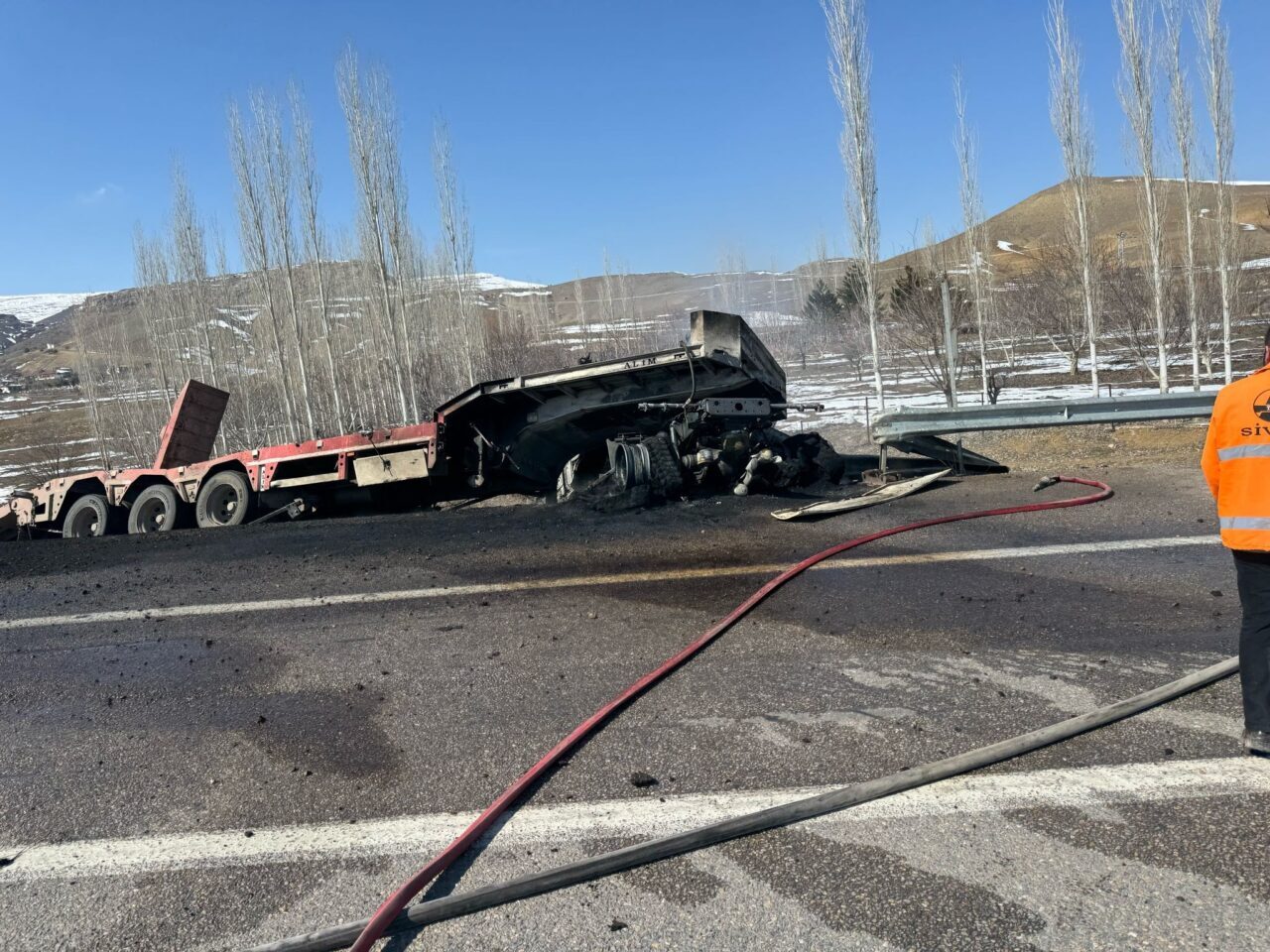 Kaza, saat 13.00 sıralarında Divriği-Kangal kara yolu Mursal Kavşağı’nda meydana geldi. Ekskavatör olarak tabir edilen iş makinesi yüklü 44 AHA 568 plakalı TIR, iddiaya göre freni tutmayınca şarampole girdi, üzerindeki iş makinesi devrilerek alev aldı. Alevler kısa sürede TIR’ı da sardı. Kazada U.A. (30), Ö.G. (32) ve Y.K (34) yaralandı. 112 Acil Çağrı Merkezi’ne yapılan ihbarla bölgeye sağlık, jandarma ve itfaiye ekipleri sevk edildi. Yaralılar, ambulansla Divriği Sadık Özgür Devlet Hastanesi’ne kaldırıldı. Yaralılardan U.A. ilk müdahalesinin ardından Sivas Cumhuriyet Üniversitesi Tıp Fakültesi Hastanesi’ne sevk edildi. Kaza sonrası TIR’da çıkan yangın Divriği Belediyesi itfaiye ekiplerinin 1 saatlik çalışmasıyla söndürüldü.