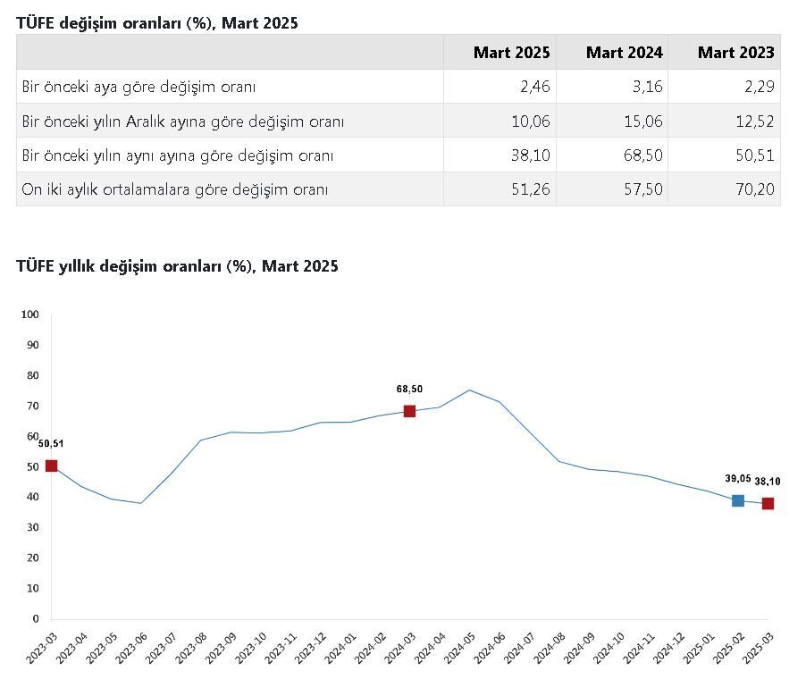 TÜİK, Mart 2025 dönemine ilişkin enflasyon verilerini açıkladı. Buna göre; tüketici fiyatları bir önceki aya göre yüzde 2,46, bir önceki yılın aralık ayına göre yüzde 10,06, bir önceki yılın aynı ayına göre yüzde 38,10 ve 12 aylık ortalamalara göre yüzde 51,26 arttı.