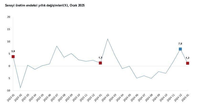 TÜİK, Ocak 2025 dönemine ilişkin sanayi üretim endeksi verilerini açıkladı. Buna göre; sanayi üretimi bir önceki yılın aynı ayına göre yüzde 1,2 arttı. Sanayinin alt sektörleri incelendiğinde, ocak ayında madencilik ve taş ocakçılığı sektörü endeksi bir önceki yılın aynı ayına göre yüzde 0,7 azaldı, imalat sanayi sektörü endeksi yüzde 1,2 arttı ve elektrik, gaz, buhar ve iklimlendirme üretimi ve dağıtımı sektörü endeksi yüzde 5 arttı.