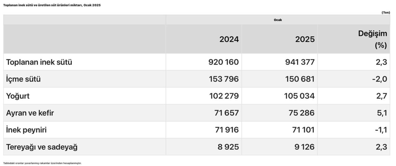 Ticari süt işletmeleri tarafından toplanan inek sütü miktarı, ocak ayında bir önceki yılın aynı ayına göre yüzde 2,3 arttı, inek peyniri üretimi yüzde 1,1 azaldı, ayran ve kefir üretimi yüzde 5,1 arttı, yoğurt üretimi yüzde 2,7 arttı, içme sütü üretimi yüzde 2 azaldı, tereyağı ve sadeyağ üretimi yüzde 2,3 arttı. Bir önceki ay 947 bin 109 ton olan ticari süt işletmelerince toplanan inek sütü miktarı ocak ayında yüzde 0,6 oranında azalarak 941 bin 377 ton oldu. Bir önceki ay 144 bin 891 ton olan içme sütü üretimi ocak ayında yüzde 4 oranında artarak 150 bin 681 ton olarak gerçekleşti.
