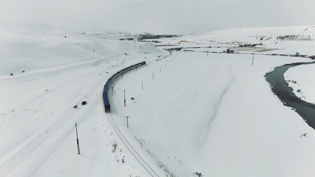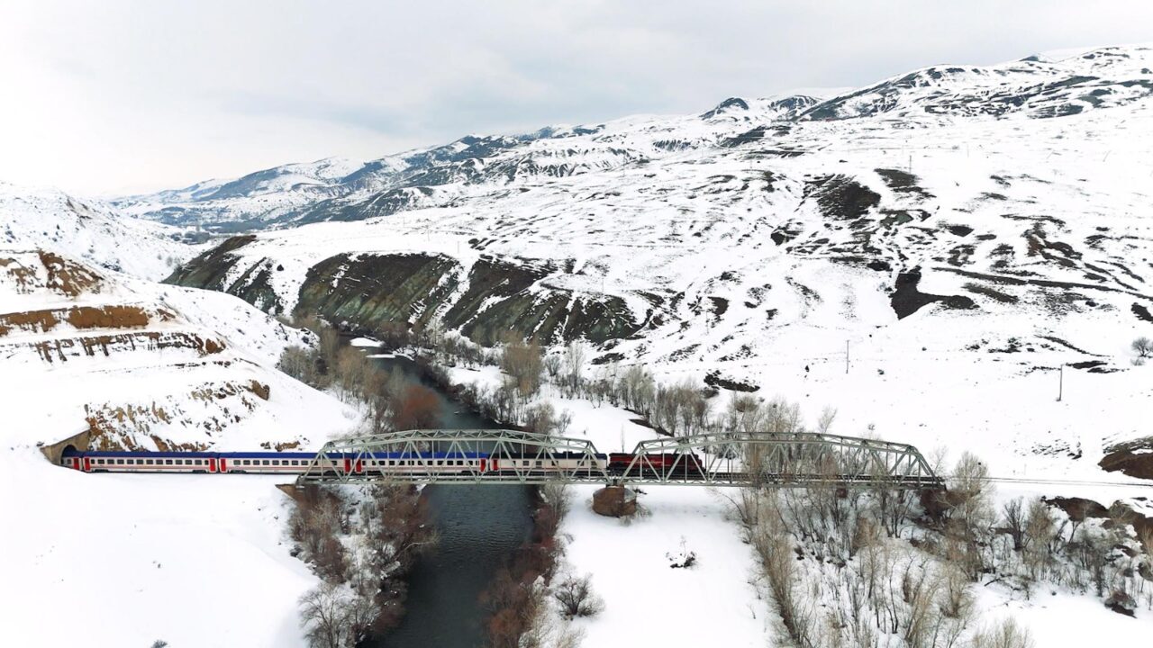 ERZURUM, -ANKARA-Kars arasında yolcu taşıyan Turistik Doğu Ekspresi’nin karla kaplı Erzurum geçişi, dronla görüntülendi.