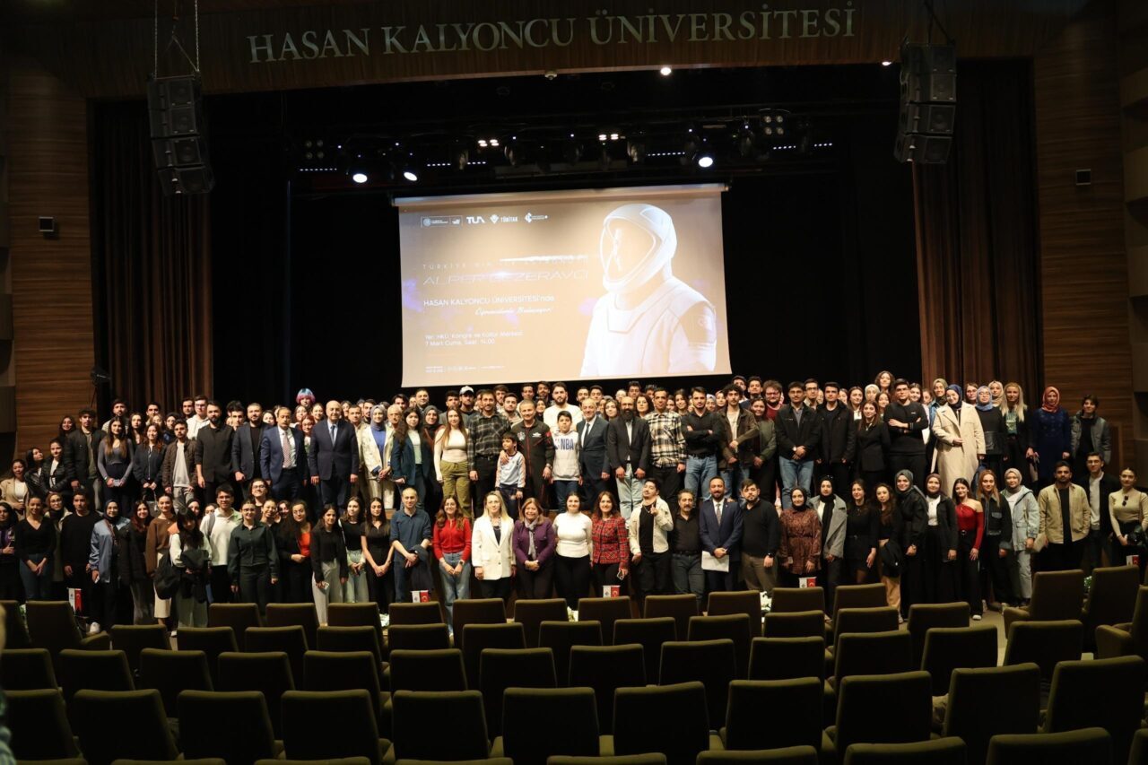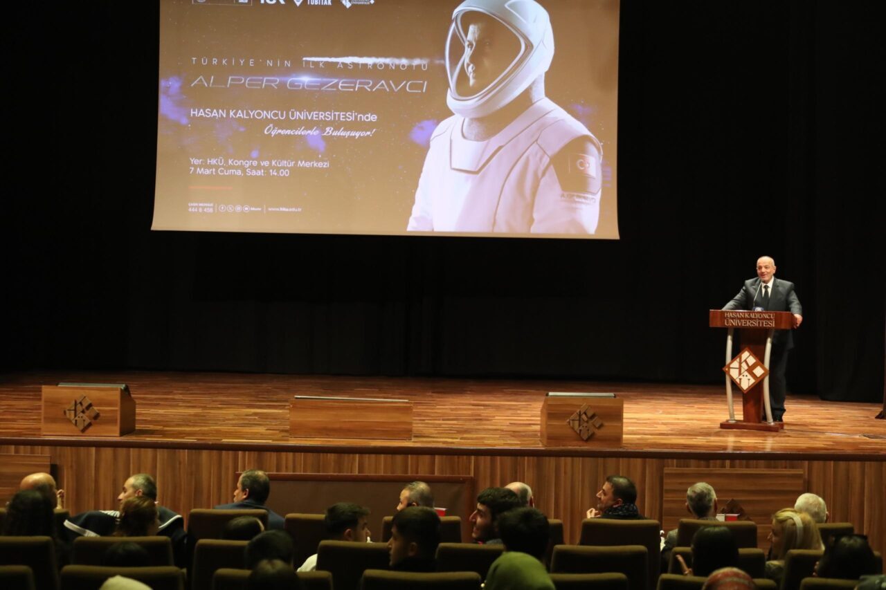Hasan Kalyoncu Üniversitesi’nde düzenlenen etkinliğe; Türkiye’nin ilk astronotu Alper Gezeravcı’nın yanı sıra Hasan Kalyoncu Üniversitesi Rektörü Prof. Dr. Türkay Dereli, Rektör Yardımcıları Prof. Dr. Mehmet Lütfi Yola ve Prof. Dr. Gül Rengin Küçükerdoğan, akademisyenler ve öğrenciler katıldı. Programın açılışında konuşan, Alper Gezeravcı’nın, Türkiye’nin uzay alanındaki vizyonunu öğrencilerle paylaşmasının büyük bir motivasyon kaynağı olduğunu belirten Rektör Prof. Dr. Türkay Dereli, “Bizler, tarihte havacılık ve uzay alanında büyük hayaller kurmuş bir milletin evlatlarıyız. Vecihi Hürkuş’tan Nuri Demirağ’a, Selçuk Bayraktar gibi vizyoner mühendislerden, bugün semalarımızda süzülen KAAN, ANKA, Bayraktar Kızılelma gibi projelere kadar uzanan bu yolculuk, geleceğe olan inancımızın bir göstergesidir. Üniversite olarak, ülkemizin havacılık ve uzay alanındaki hedeflerine katkı sunmak için önemli adımlar atmaktayız. Havacılık ve Uzay Bilimleri Fakültemiz, Eylül 2022’de ilk öğrencilerini kabul ederek eğitim hayatına başlamış, geleceğin havacılık, uzay ve savunma sanayi mühendislerini yetiştirme misyonuyla yola çıkmıştır. TUSAŞ, TEI ve savunma sanayi kuruluşlarıyla yaptığımız projeler, öğrencilerimizin gerçek Ar-Ge süreçlerinde yer almasını sağlıyor. Türkiye’nin uzaydaki yerini sağlamlaştırmak için, bilime, teknolojiye ve araştırmaya daha fazla yatırım yapmaya devam edeceğiz” dedi.