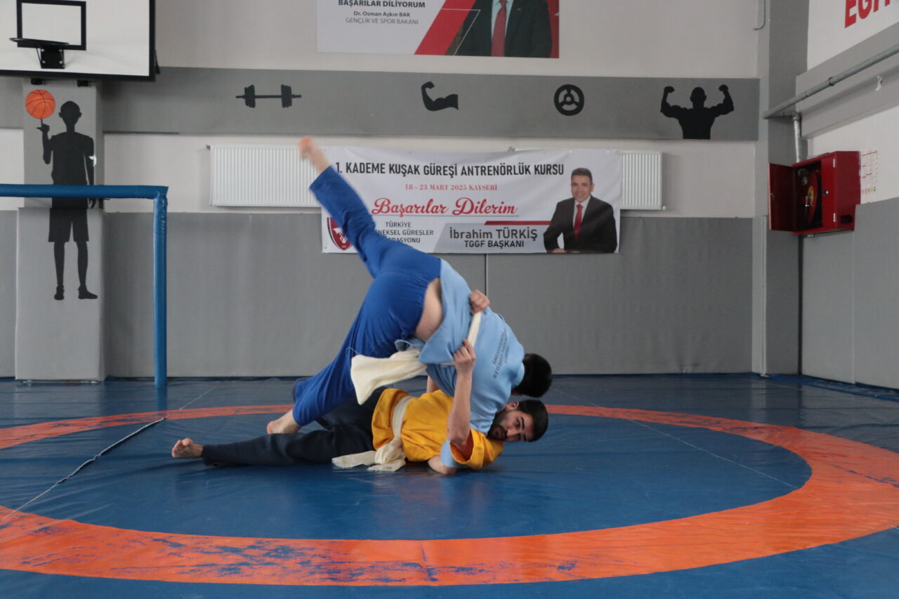 Furkan KAVUKLU/KAYSERİ, – GENÇLİK ve Spor Bakanlığı Geleneksel Güreşler Federasyonu tarafından Türkiye’nin ilk ‘kuşak güreşi’ antrenörleri, Kayseri’de açılan kurs ile yetiştiriliyor. 20 ilden gelen 40 kursiyer, görecekleri 1 haftalık eğitimin ardından ülkenin dört bir yanından güreşçi yetiştirecek. Türkiye Geleneksel Güreşler Federasyonu Asbaşkanı Mehmet Emin Bay, “Kursumuza 40 antrenör adayımız başvuru yaptı. Bu adaylarımız beden eğitimi ve spor yüksek okulu veya spor bilimleri fakültesi mezunu öğretmen ve antrenörlerdir. Burada oyun teknikleri ile ilgili uygulama eğitimleri, antrenörlerin sporculara psikolojik anlamda nasıl yaklaşmaları gerektiği ile ilgili eğitimler verildi. Geleneksel güreşler ile gençlerimize kültürümüzü de aktarmış olacağız ve hayat tarzı olarak benimsemiş olacaklar” dedi.