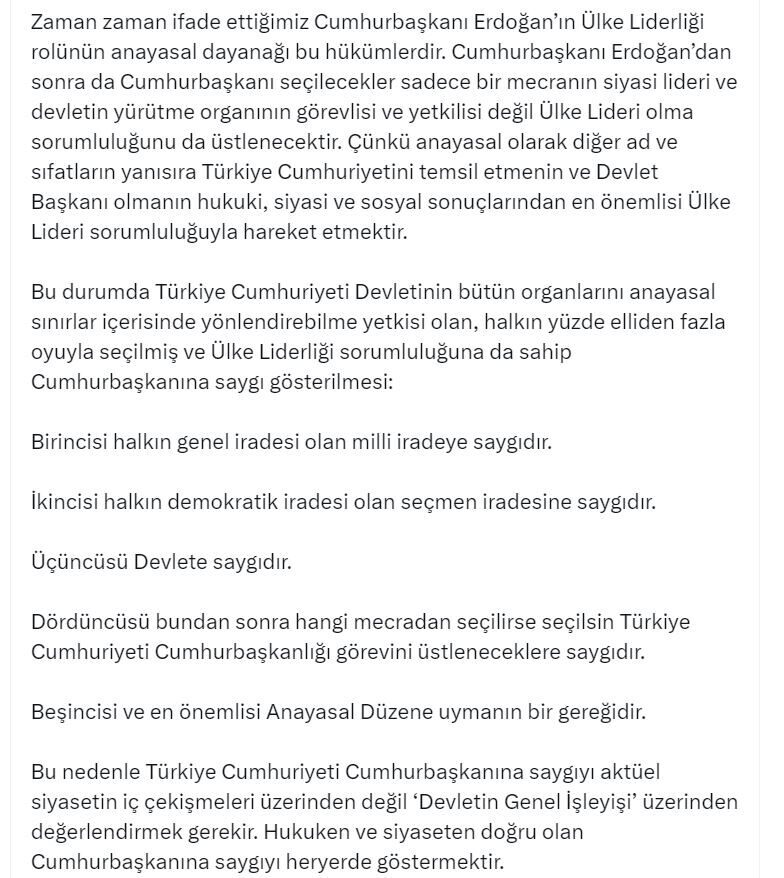 Dolayısıyla Türkiye Cumhuriyeti Cumhurbaşkanının, yürütme görevinin yanı sıra yasamaya da yargıya da düzenli ve uyumlu çalışma konusunda perspektif sunma görevi ve yetkisine sahip olduğunu belirterek, “Ayrıca cumhurbaşkanı milli güvenlik politikalarını belirler, TBMM adına başkomutanlığı temsil eder. Yani cumhurbaşkanı aynı zamanda Türk Silahlı Kuvvetleri’nin başkomutanıdır. Türk Silahlı Kuvvetleri’nin kullanılmasına karar verme yetkisi vardır. Anayasaya göre hem halkın başkanı hem devlet başkanı hem de başkomutan olan cumhurbaşkanı aynı zamanda Türkiye Cumhuriyeti’ni ve Türk milletinin birliğini temsil eder. Zaman zaman ifade ettiğimiz Cumhurbaşkanı Erdoğan’ın ülke liderliği rolünün anayasal dayanağı bu hükümlerdir. Cumhurbaşkanı Erdoğan’dan sonra da cumhurbaşkanı seçilecekler sadece bir mecranın siyasi lideri ve devletin yürütme organının görevlisi ve yetkilisi değil ülke lideri olma sorumluluğunu da üstlenecektir. Çünkü anayasal olarak diğer ad ve sıfatların yanı sıra Türkiye Cumhuriyeti’ni temsil etmenin ve devlet başkanı olmanın hukuki, siyasi ve sosyal sonuçlarından en önemlisi ülke lideri sorumluluğuyla hareket etmektir. Bu durumda Türkiye Cumhuriyeti Devletinin bütün organlarını anayasal sınırlar içerisinde yönlendirebilme yetkisi olan, halkın yüzde elliden fazla oyuyla seçilmiş ve ülke liderliği sorumluluğuna da sahip Cumhurbaşkanına saygı gösterilmesi: Birincisi halkın genel iradesi olan milli iradeye saygıdır. İkincisi halkın demokratik iradesi olan seçmen iradesine saygıdır. Üçüncüsü Devlete saygıdır. Dördüncüsü bundan sonra hangi mecradan seçilirse seçilsin Türkiye Cumhuriyeti cumhurbaşkanlığı görevini üstleneceklere saygıdır. Beşincisi ve en önemlisi anayasal düzene uymanın bir gereğidir” değerlendirmesinde bulundu.