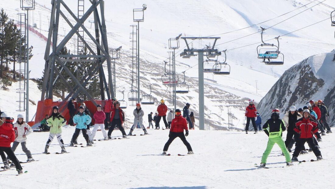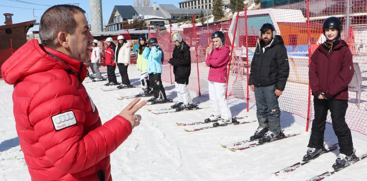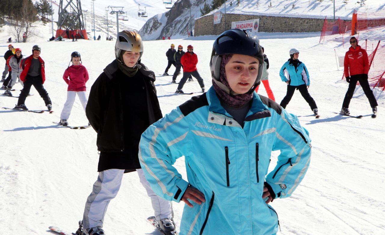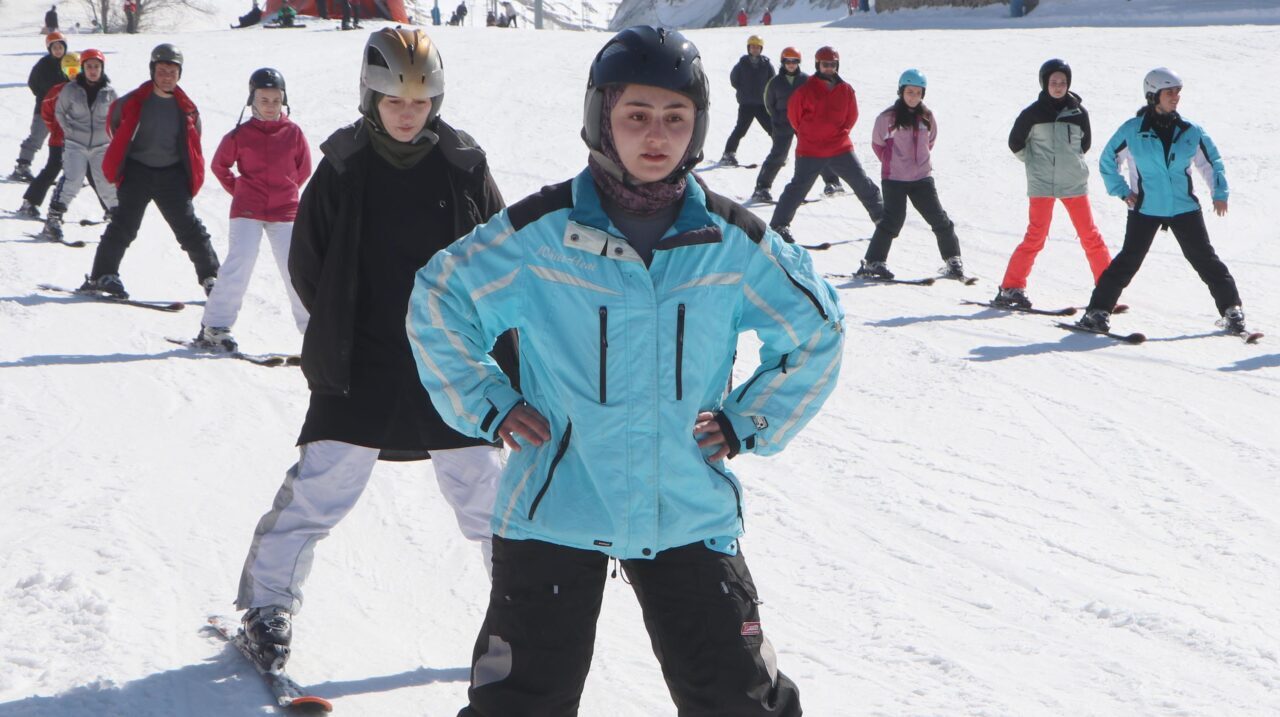 Turgay İPEK/ERZURUM, – ERZURUM, Atatürk Üniversitesi’nin çeşitli fakültelerinde okuyan öğrenciler, Spor Bilimleri Fakültesi’nin, ‘Kardan Umutlar’ projesi kapsamında ilk kez çıktıkları Palandöken Kayak Merkezi’nde kayak yapmanın heyecanını yaşadı. Eğitmenlerin acemi pistinde kayak eğitimi verdiği öğrencilerden Nisa Sarı, “Erzurum’da yaşıyorum ama her gün uzaktan gördüğüm Palandöken’i gezme ve kayak yapma fırsatı bulamamıştım. Bu güzel duyguyu 20 yaşında tatmış oldum” dedi.